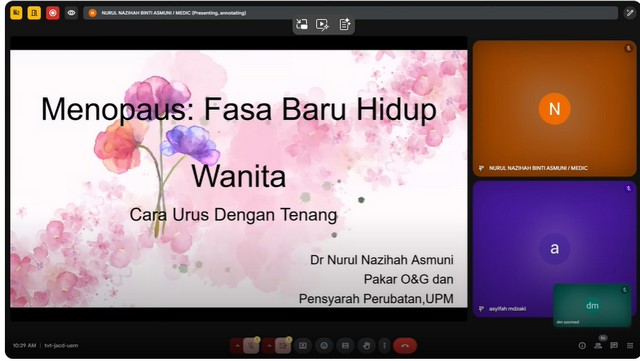 25 Julai 2025 | Aktiviti TerkiniWebinar Studio Sihat kali ini membawa topik yang sangat penting dan dekat di hati ramai wanita, iaitu "Menopaus Bukan Penamat! Apa Wanita Perlu Tahu". Webinar ini bertujuan untuk memberikan kesedaran dan pengetahuan kepada golongan wanita tentang perubahan yang berlaku dalam fasa menopaus serta cara untuk menghadapinya dengan tenang dan positif.