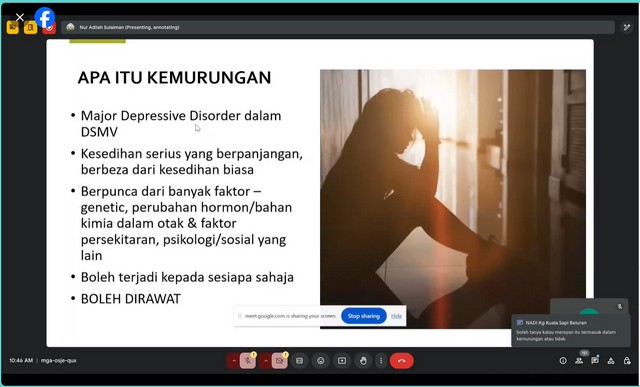 18 Januari 2025 | Aktiviti TerkiniPada 17 januari 2025 (Jumaat), petugas NADI telah menyertai sesi webinar kesejahteraan kendiri yang bertajuk Kemurungan (Depression): Kenal, cegah & rawat bersama Dr. Nur Adilah Sulaiman, Pakar Psikiatri Hospital Bintulu.