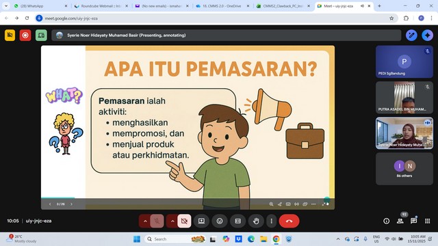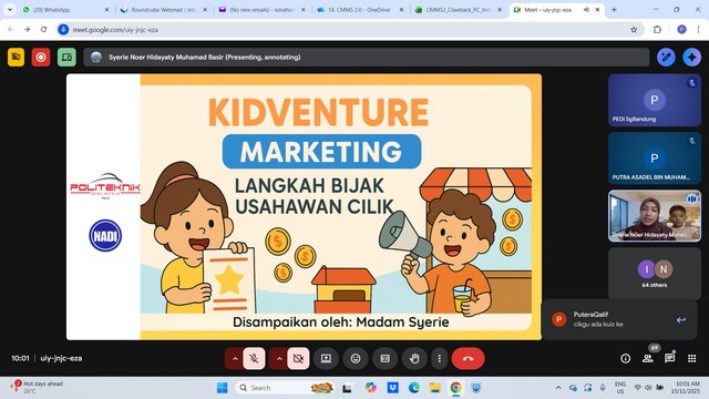 16 November 2025 | Aktiviti TerkiniPada 15 November 2025, dua orang peserta dari NADI Sungai Bandung telah menyertai Webinar Kidventure Cohort 7: Pemasaran Dengan Elemen AI yang dijalankan secara dalam talian. Webinar ini bertujuan memperkenalkan peserta kepada konsep asas pemasaran serta bagaimana elemen kecerdasan buatan (AI) boleh diaplikasikan dalam strategi pemasaran.