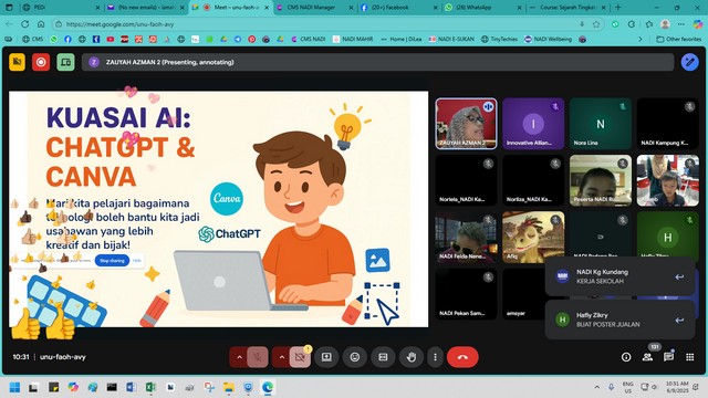 7 September 2025 | Aktiviti TerkiniPada 06 September 2025 (Sabtu), NADI Sungai Bandung telah menyertai Webinar Kidventure Cohort 5 bertajuk Pemasaran Dengan Elemen AI yang memberi tumpuan kepada penguasaan ChatGPT dan Canva AI dalam strategi pemasaran digital. Peserta mempelajari cara menggunakan ChatGPT untuk menjana idea kreatif, menulis salinan promosi yang menarik serta merancang strategi kandungan, manakala Canva AI dimanfaatkan untuk menghasilkan grafik, poster dan video dengan cepat dan profesional. Selain itu, peserta turut didedahkan dengan teknik merekabentuk poster produk menggunakan aplikasi digital secara praktikal, sekali gus menunjukkan bagaimana AI dapat memudahkan urusan pemasaran, menjimatkan masa dan meningkatkan kualiti hasil kerja.