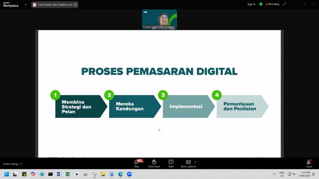 Sesi pembelajaran dijalankan secara interaktif, di mana peserta berpeluang mencuba sendiri menghasilkan idea visual ringkas menggunakan perisian percuma dalam talian. Pendekatan ini membantu peserta memahami bagaimana komunikasi visual yang baik boleh meningkatkan daya tarikan sesuatu produk, membina identiti jenama, serta meningkatkan kepercayaan pelanggan.