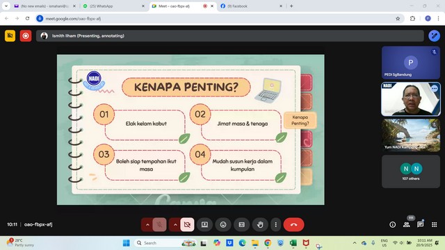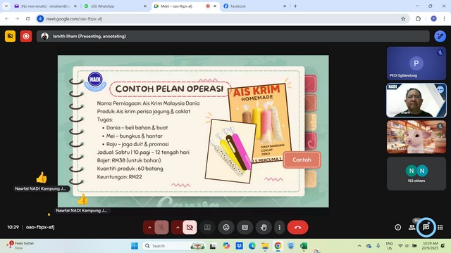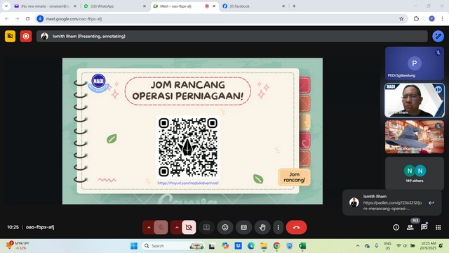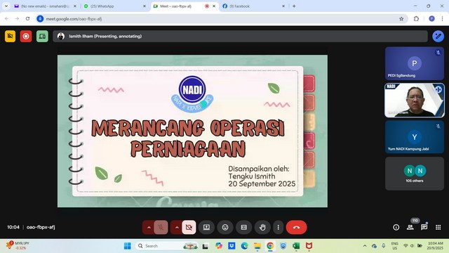 21 September 2025 | Aktiviti TerkiniPada 20 September 2025, dua orang peserta dari NADI Sungai Bandung telah menyertai Webinar Kidventure Operasi Perniagaan yang dianjurkan secara dalam talian. Webinar ini memberi pendedahan kepada peserta mengenai konsep asas dan pengurusan operasi perniagaan yang teratur serta berkesan.