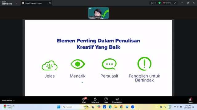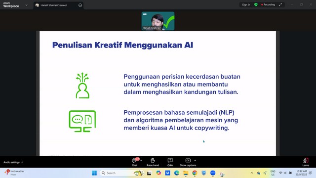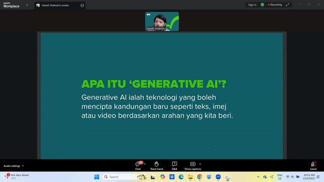 Sepanjang sesi, peserta diberi pendedahan tentang pelbagai aplikasi AI yang boleh membantu dalam menghasilkan poster, video pendek, penulisan iklan, serta kandungan media sosial. Penceramah menekankan bagaimana AI dapat menjimatkan masa, meningkatkan kualiti hasil kerja, serta memberi idea baharu dalam pemasaran digital.