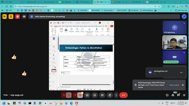 Sepanjang bengkel, peserta dibimbing langkah demi langkah bermula daripada proses memuat turun Thonny IDE, memahami antaramuka asasnya, hinggalah kepada menulis kod ringkas menggunakan MicroPython. Peserta turut mencuba fungsi asas kit inovasi, antaranya mengawal LED serta berinteraksi dengan sensor melalui arahan pengaturcaraan mudah.