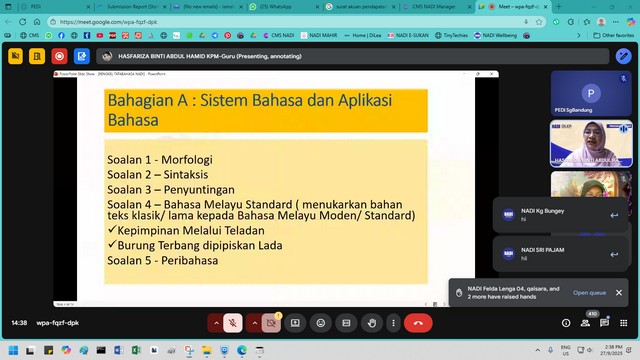 28 September 2025 | Aktiviti TerkiniPada 27 September 2025, dua orang pelajar sekolah menengah telah menyertai Webinar Berkala Bahasa Melayu – Edisi 4 di NADI Sungai Bandung. Webinar ini dijalankan secara dalam talian dan disampaikan dalam suasana santai tetapi padat dengan penerangan, tips dan trik tatabahasa bagi membantu pelajar lebih mudah memahami aturan bahasa yang betul.