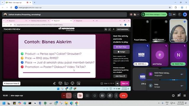 21 Februari 2026 | Aktiviti TerkiniPada 21 Februari 2026, dua orang peserta telah menyertai Webinar Kidsventure Pemasaran 1 di NADI Sungai Bandung melalui platform Google Meet. Peserta diberikan pendedahan mengenai konsep asas pemasaran, termasuk cara memperkenalkan produk atau perkhidmatan kepada orang ramai secara kreatif dan berkesan. Webinar ini juga menjelaskan bagaimana pemasaran dapat menarik minat pelanggan serta meningkatkan jualan. Tenaga pengajar, Puan Zafirah Amalina Zainol Anuar, turut berkongsi contoh praktikal melalui bisnes aiskrim untuk membantu peserta memahami penerapan konsep pemasaran dalam dunia sebenar.