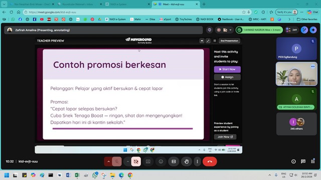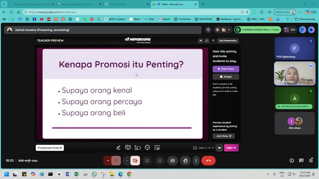 28 Februari 2026 | Aktiviti TerkiniPada 28 Februari 2026, dua orang peserta telah menyertai Webinar Kidsventure Pemasaran 2 yang dijalankan secara dalam talian melalui platform Google Meet. Webinar ini bertujuan memberi pendedahan mengenai maksud promosi, kepentingannya dalam meningkatkan kesedaran jenama, menarik pelanggan serta membantu meningkatkan jualan sesuatu produk atau perkhidmatan.