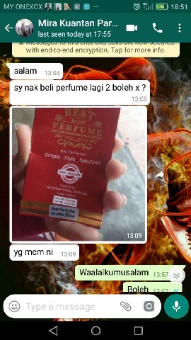 Menurut beliau, bukan rakan-rakan Facebook beliau shaja, malah dengan perkongsian post beliau di Facebook oleh rakan-rakannya, Puan Noralima mendapat banyak permintaan dari luar. Bagi beliau, dengan melakukan bisnes secara oline memudahkan beliau untuk mengembangkan pewanginya. Untuk maklumat lanjut bolehlah menghubungi beliau di wasap.my/60198199589 atau www.facebook.com/noralima79